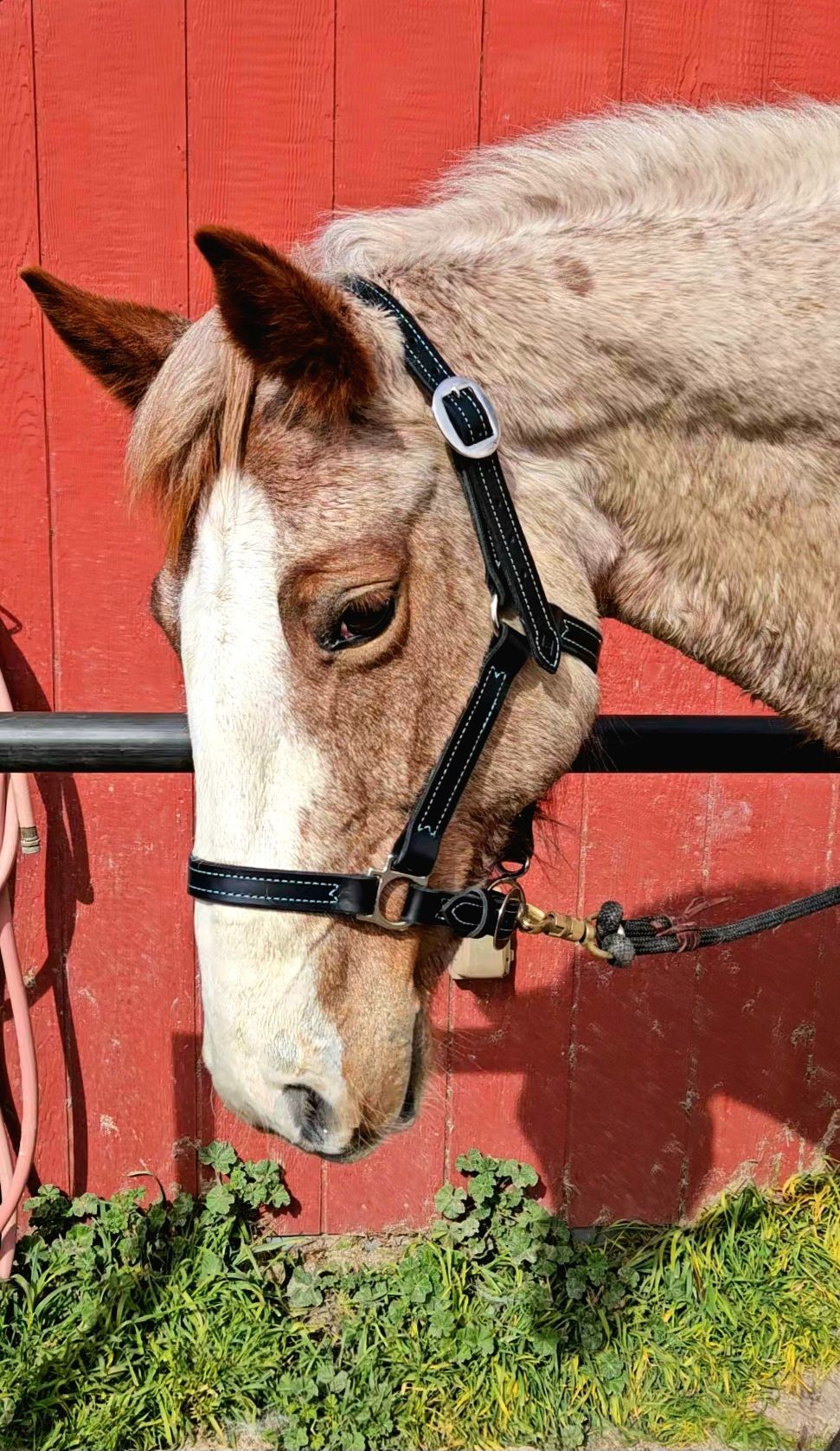 This halter is made out of beautiful black harness leather with a mint stitching for contrast. very classy with a little flare of color. size is AVERAGE to LARGE